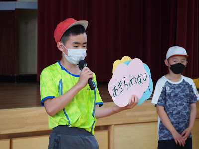 1学期が終了しました。終業式では、各学級(小1,2年、小3,4年、小5,6年、中学生)の代表が、1学期の振り返りと夏休みの過ごし方について壇上で述べました。ハキハキとした聞き取りやすい発表でした。