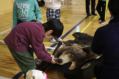 今日は公益財団法人知床財団から2名の講師を招いて『ヒグマ講座』を実施しました。小1~小4、小5~中学生の2部に分けて講座が開催され、根室市のヒグマ目撃情報やヒグマの生態、ヒグマと会ったときの対処法など、ヒグマに対する正しい知識を学ぶことができました。